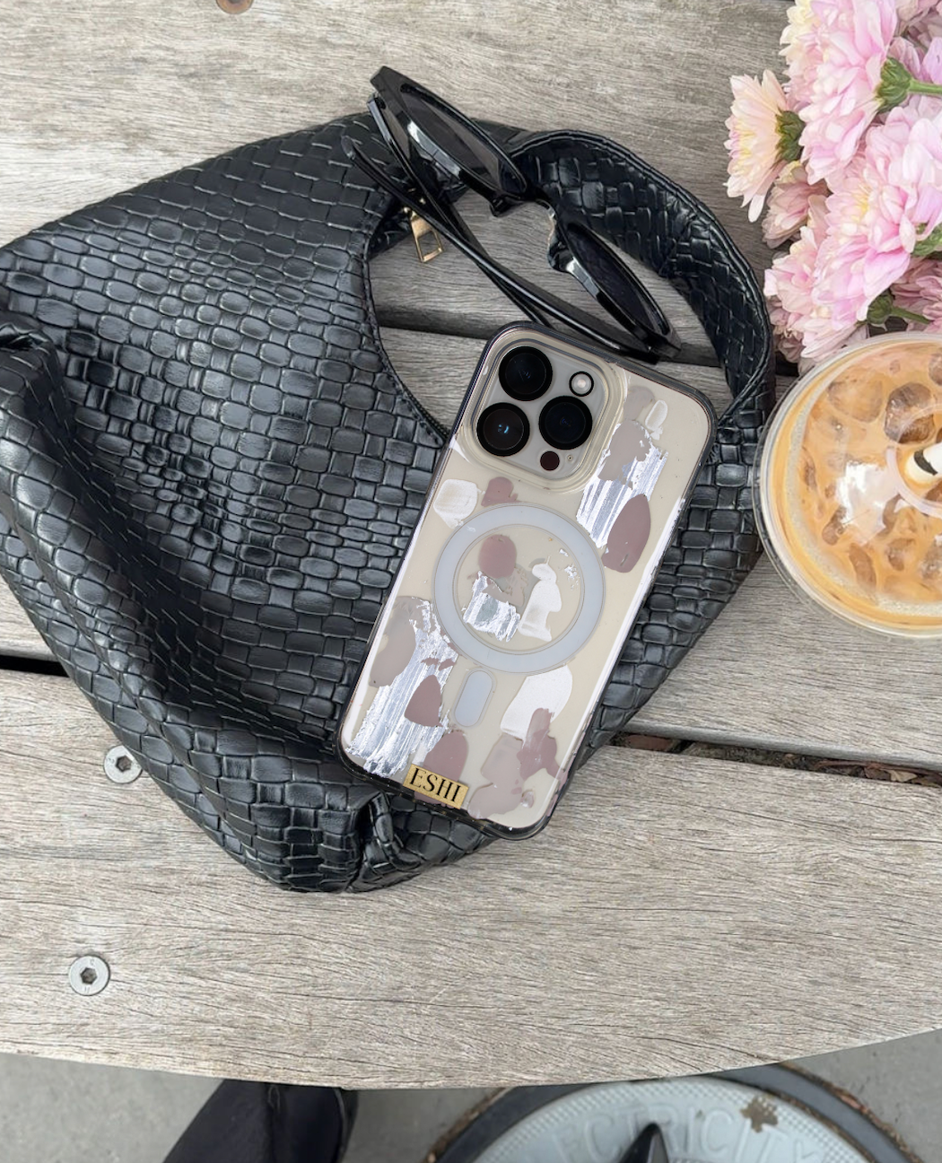 Inspirado en la elegancia de lo abstracto y con el plus de que la funda sea MagSafe ayudando así al agarre del dispositivo con diferentes accesorios MagSafe y con los colores elegantes del beige, perla y rosa palo con el toque único de la hoja de plata. ¡Estoy segura que te encantará!